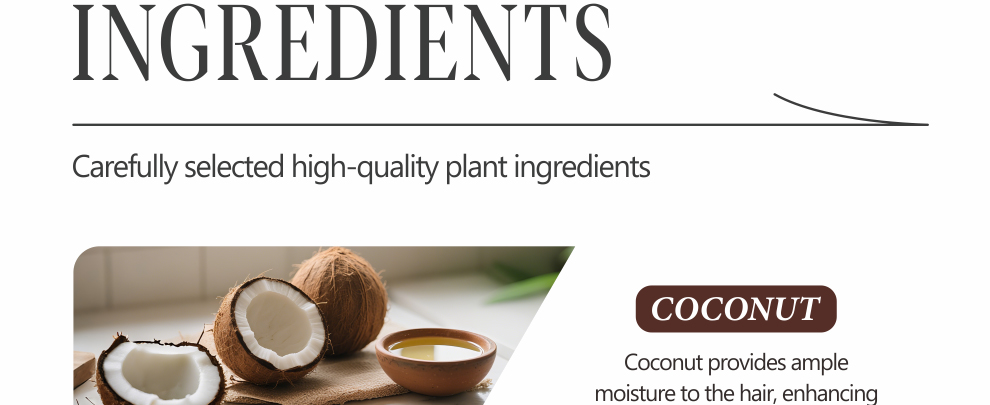 COCONUT AND PROTEIN AND COLLAGENCoconut shampoo infuses abundant moisture into the hair,providing deep hydration and nourishment from the rootsto the tips without making the hair feel heavy or sticky.